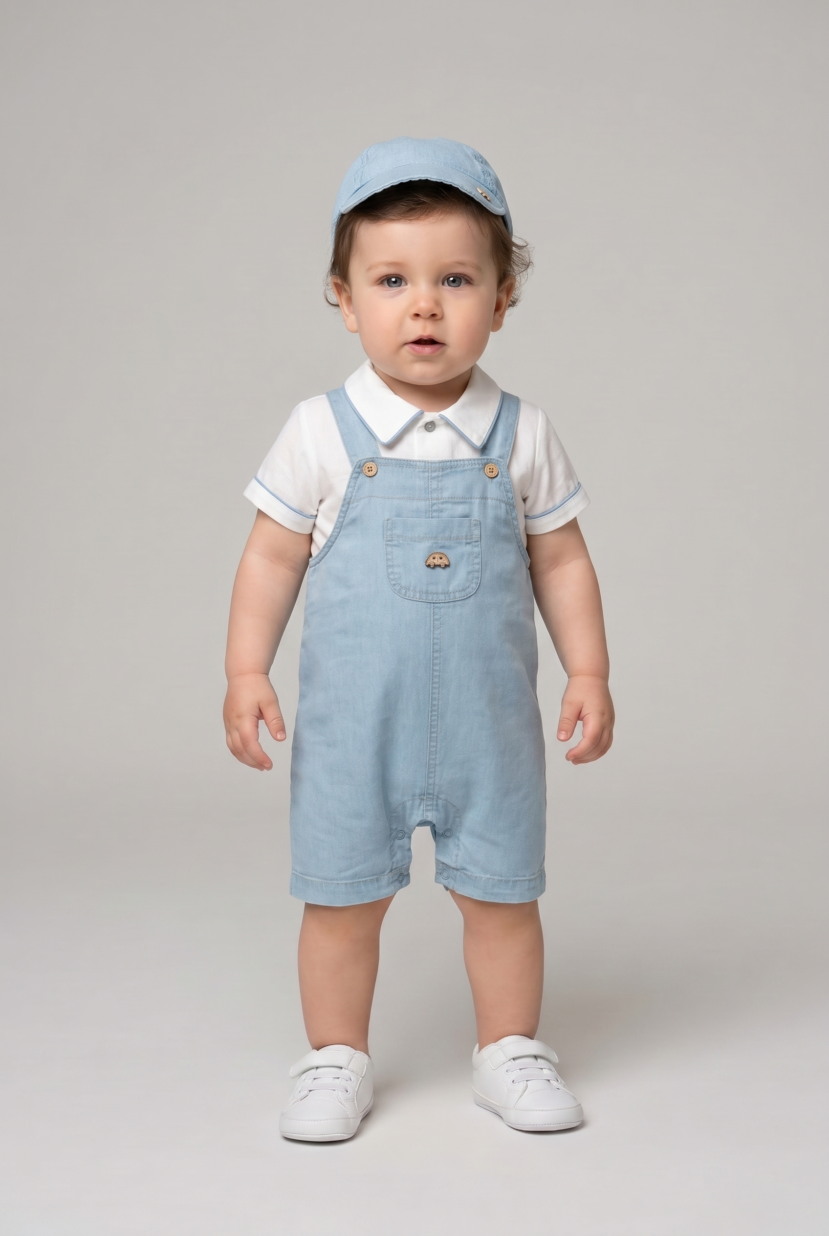 Yaz güneşinin enerjisini minik beylerin tarzıyla buluşturan Şapkalı Erkek Bebek İnce Kot Salopet Takımı, hem nostaljik hem de çok modern bir şıklık sunuyor. 9-24 ay arası bebeklerin hareketli yapısına uyum sağlayan %100 pamuklu dokusuyla, konfor ve zarafet tek bir pakette birleşiyor.